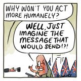 I was shocked to hear our Prime Minister warn Afghan refugees that if they get on a boat, they will not be welcome in Australia. Given the unfolding crisis, how could he be so mean spirited and so political towards these people? Where is his Christian charity he professes with his religious affiliation? How can he misread to room so badly? I was ashamed to hear our leader sounding so tone deaf to a situation that requires compassionate leadership.